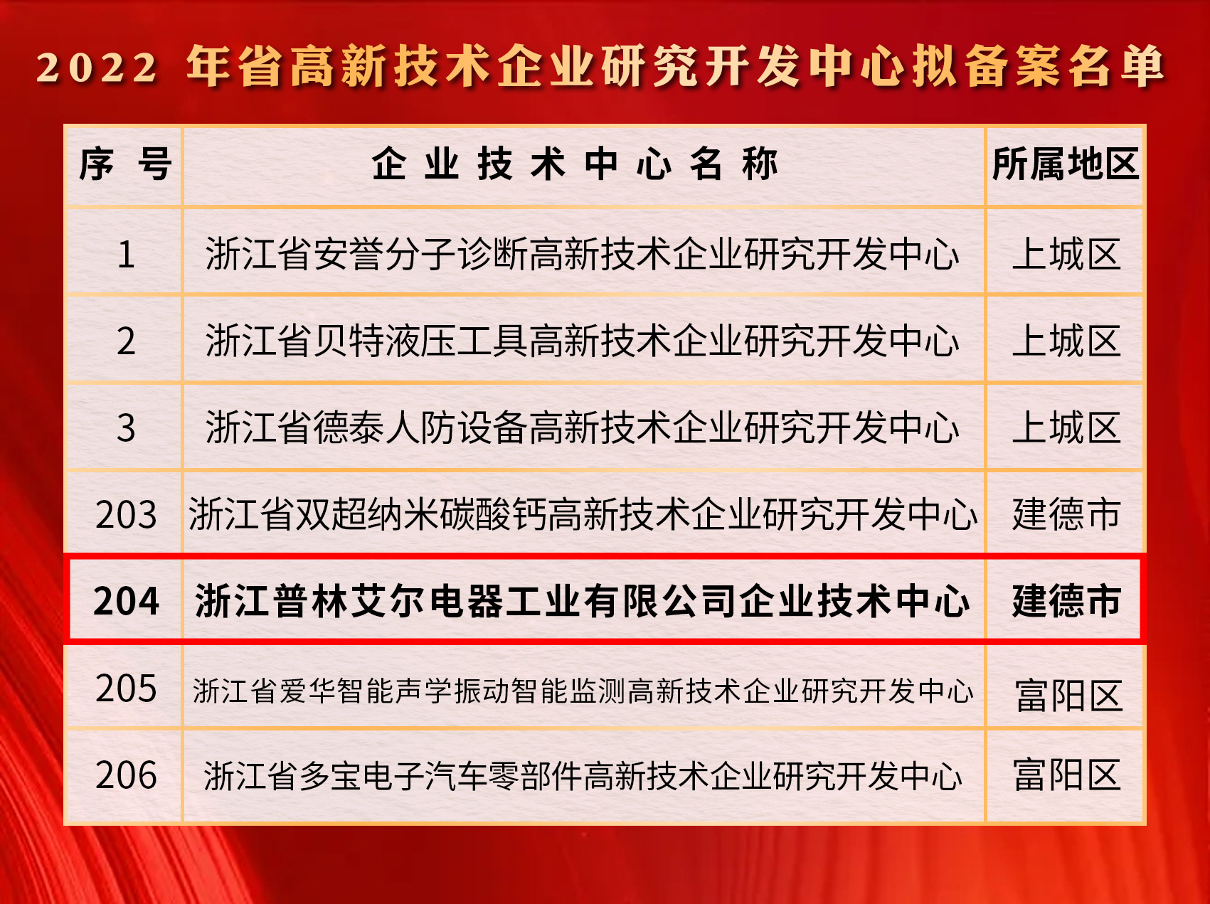 浙江普林艾爾電器工業有有限公司成功入選,被認定為2022年省高新技術企業研究開發中心。